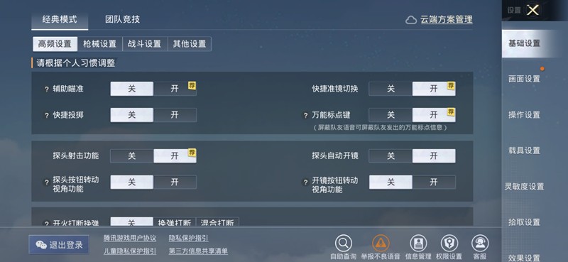 基础设置方面,建议在高频设置中关闭辅助瞄准功能,开镜探头设置为长按模式,同时关闭探头转动视角。枪械设置中需要开启左手开火按钮,陀螺仪选择总是开启状态。战斗设置中将探头模式调整为长按,并关闭探头自动开镜功能。画质方面选择流畅即可保证操作流畅度。