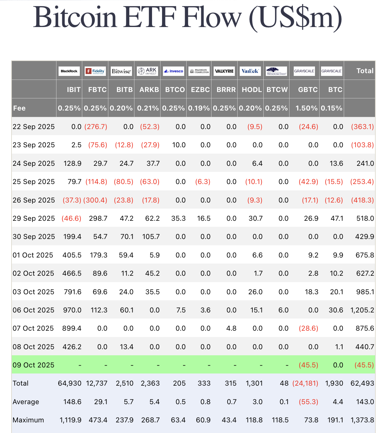 10月8日,美国现货比特币ETF延续上涨动能,在周末强劲表现后再度录得显著净流入。Farside Investors数据显示,当日所有基金净流入总额达4.407亿美元,其中贝莱德iShares比特币信托(IBIT)贡献4.262亿美元,Ark/21Shares ARKB基金也获得1340万美元流入。自10月7日当周以来,净流入已接近13亿美元,彰显投资者对比特币敞口的持续需求。