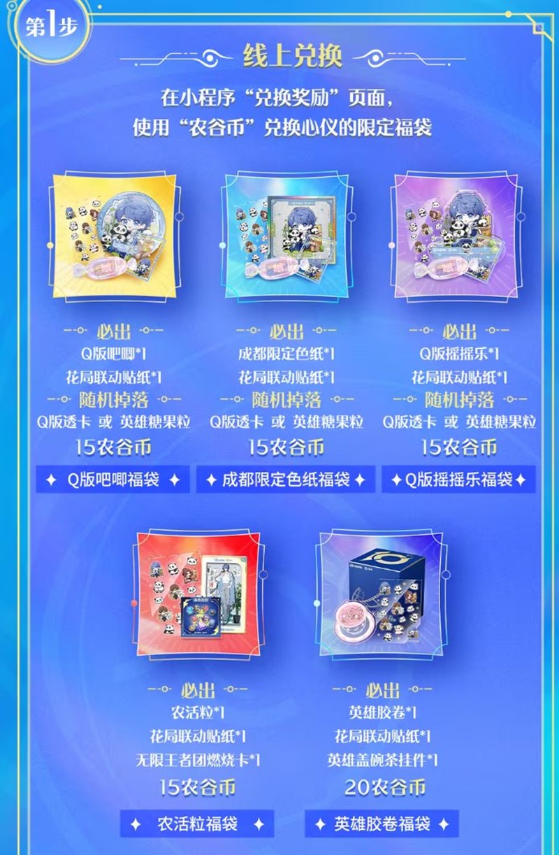 玩家在收集英雄卡的同时,还能获得虚拟代币“农谷币”。这些代币可以在线上通过小程序“王者营地”兑换十周年城市限定周边福袋,包括英雄胶卷、Q版吧唧、成都限定色纸、Q版摇摇乐等丰富周边。
