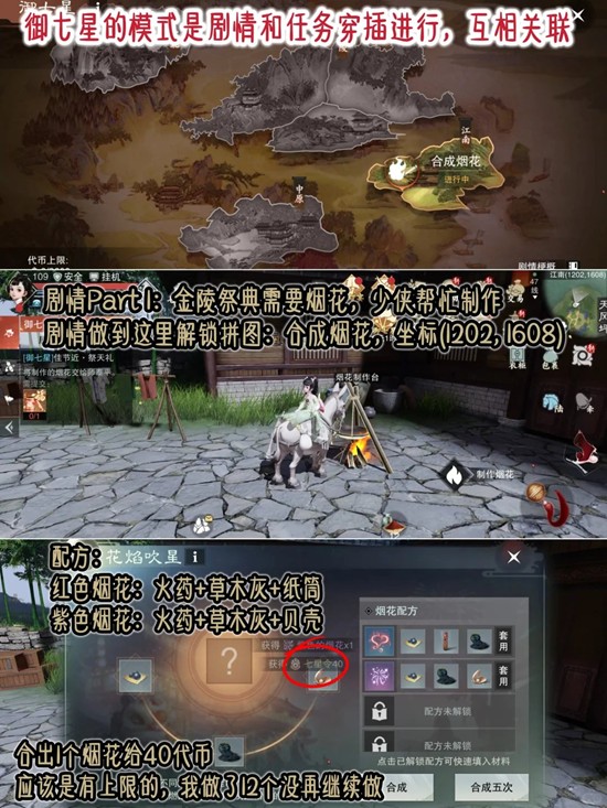 剧情Part 1:金陵祭典需要烟花,少侠帮忙制作。剧情做到这里解锁拼图:制作烟花,坐标和配方详见图3,合成1个给40代币,应该是有上限的,我做了12个没再继续做