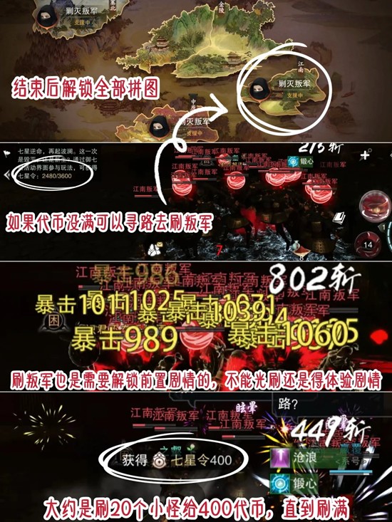 结束后解锁全部拼图,如果代币没满可以寻路去刷叛军,大约是刷20个小怪给400代币,直到刷满。刷叛军也是需要解锁前置剧情的,不能光刷还是得体验剧情