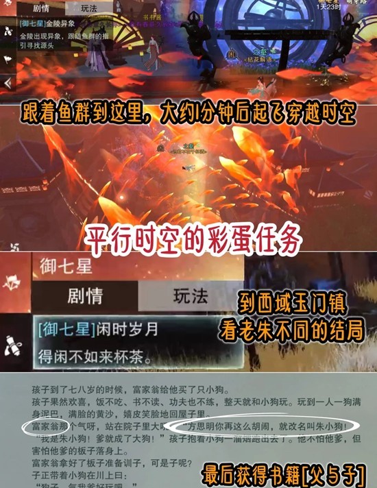 跟着鱼群到金陵,大约等1分钟后起飞穿越时空,到西域玉门镇看老朱不同的结局,最后获得书籍