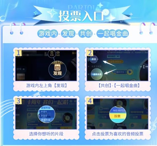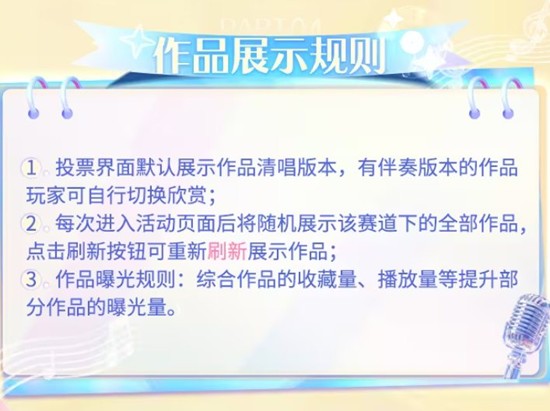展示方式:投票界面默认展示作品清唱版本,有伴奏版本的作品玩家可自行切换欣赏;