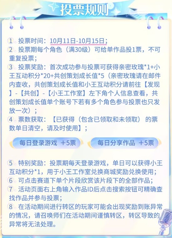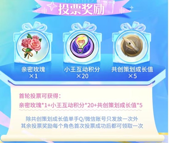 投票奖励:首次成功参与投票可获得亲密玫瑰1+小王互动积分20+共创策划成长值*5(亲密玫瑰请在邮件内查收,共创策划成长值和小王互动积分请前往【发现】-【共创】-【小王工作室】左下角个人信息查看,共创策划成长值单个账号下若有多个角色参与投票也只发放一次);