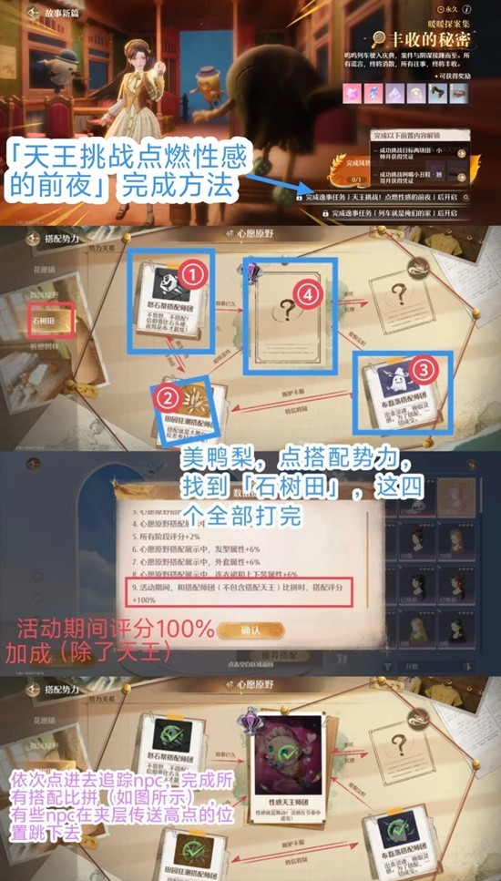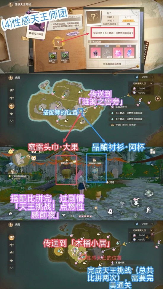 打开美鸭梨,点「搭配势力」,完成“石树田”搭配比拼,依次点进去追踪npc,往高处传送,好几个在顶部,有几个要从高处跳下去找