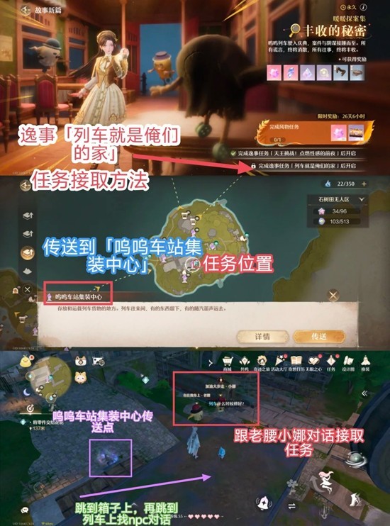 传送到「呜呜车站集装中心」,跳到传送点前面的列车顶,找老腰对话接取任务,根据指引完成呜呜列车修复(修复完体验坐车可以随时跳下来,列车定时自动开的)