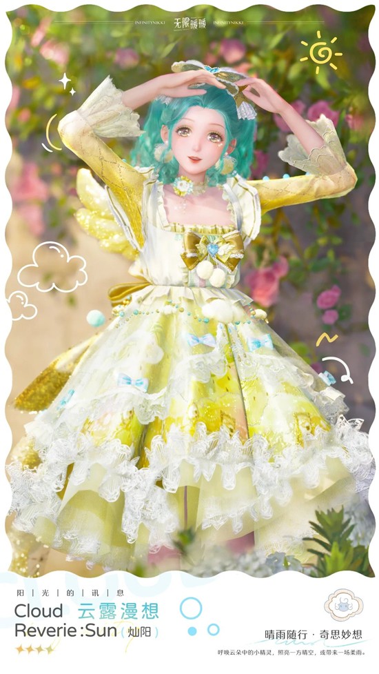 「云露漫想」进化后为套装「云露漫想·灿阳」。套装焕新完成后可获得「云露漫想·雾雨」。