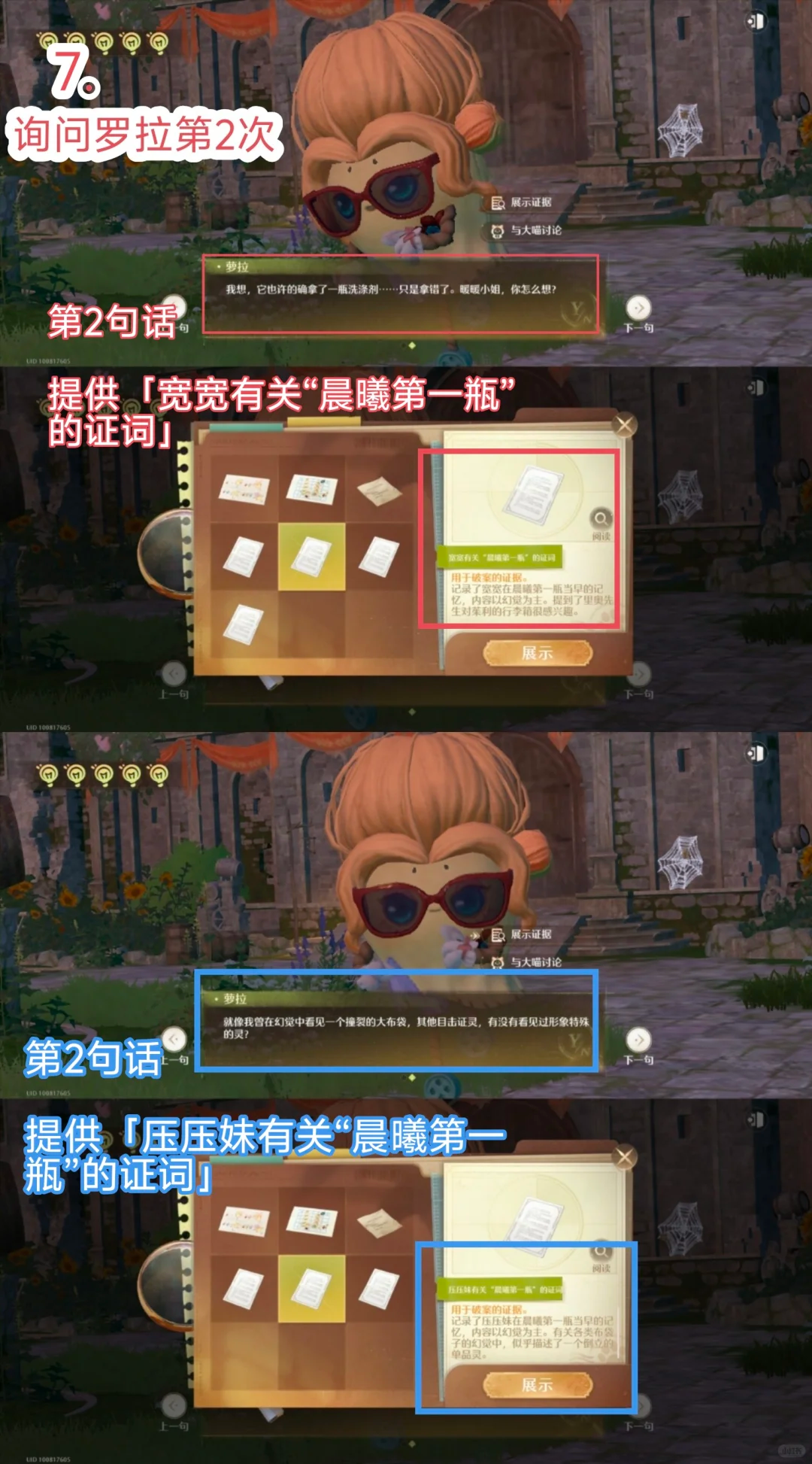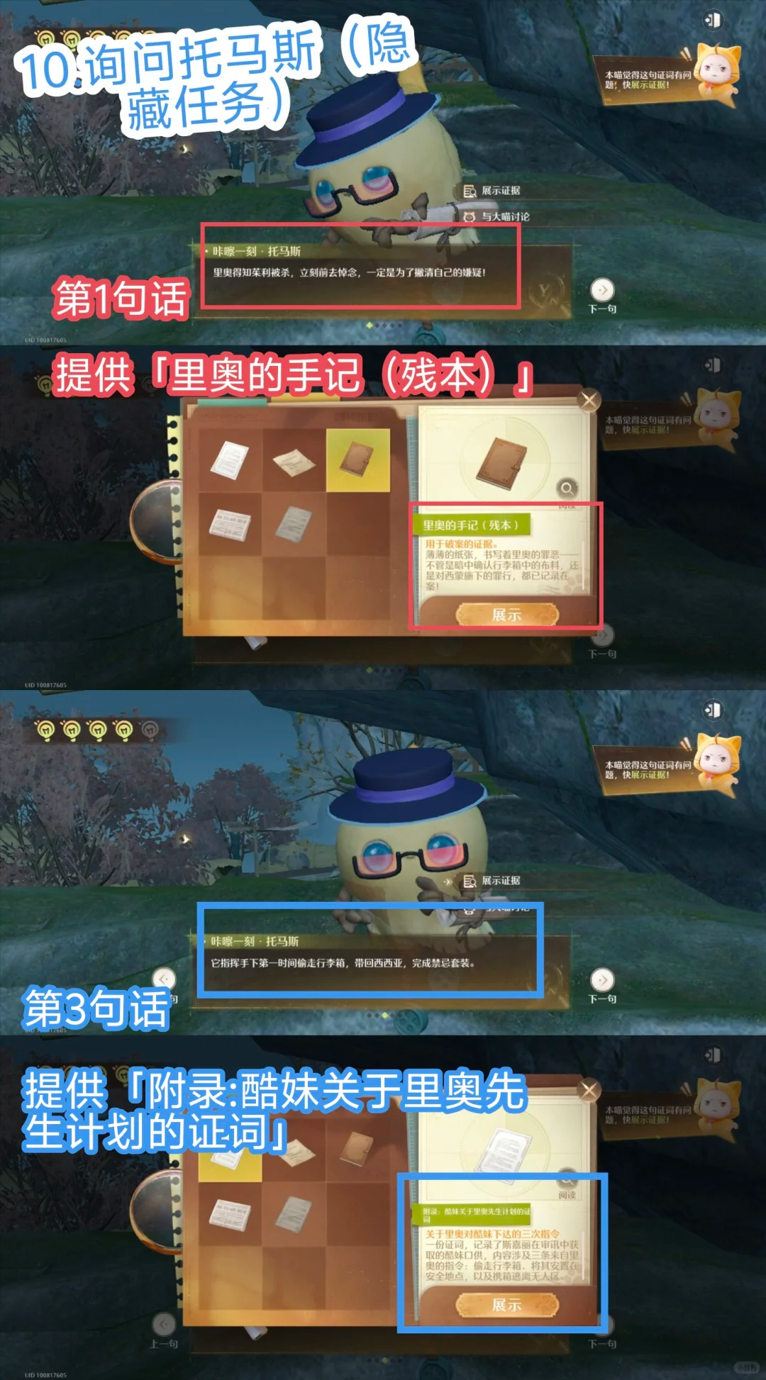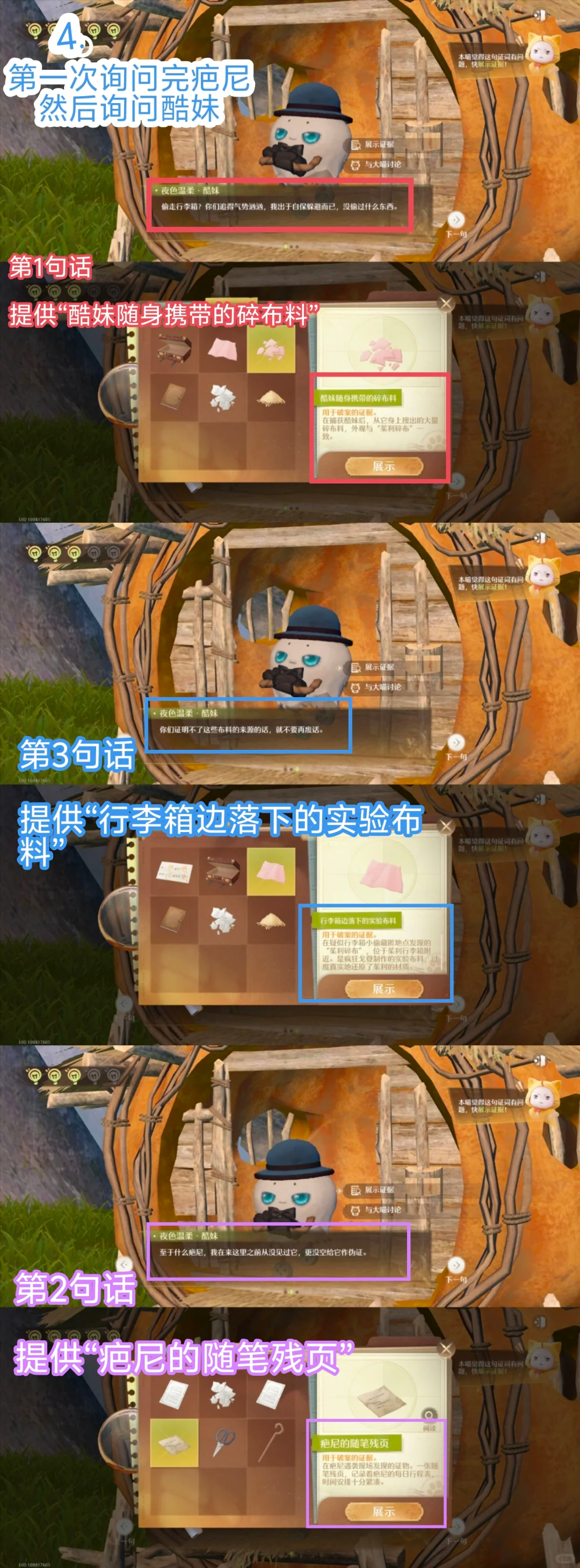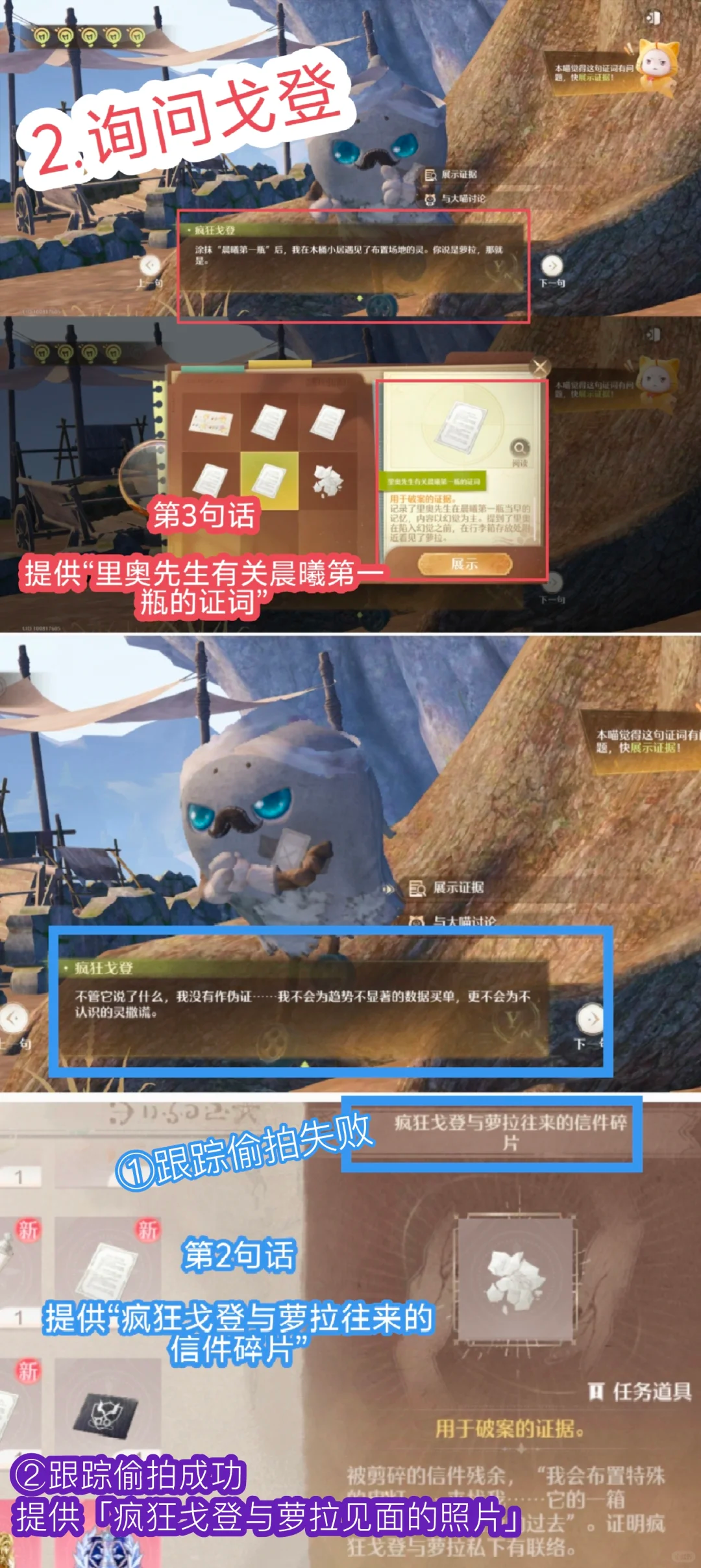 无限暖暖1.10丰收季主线任务中需要对角色选择并提交各种证据,询问托马斯时先选择托马斯的涟漪庄园特色名片,然后选择阿杯和朋友的合影;跟踪失败时提供疯狂戈登与萝拉往来的信件碎片,跟踪成功提供疯狂戈登与萝拉往来的信件照片,然后询问戈登选择提供里奥先生有关晨曦第一瓶的证词,完整的提交证词选项内容见下文详情!