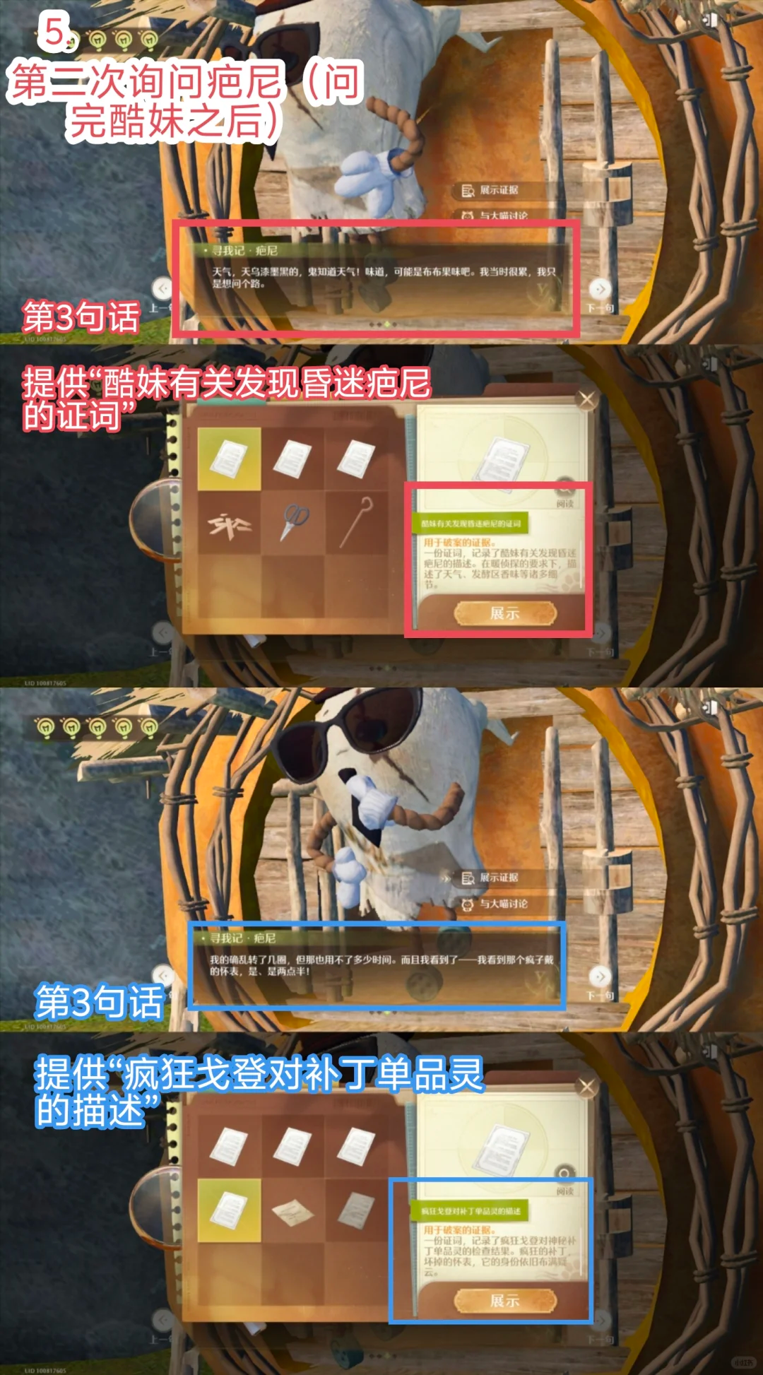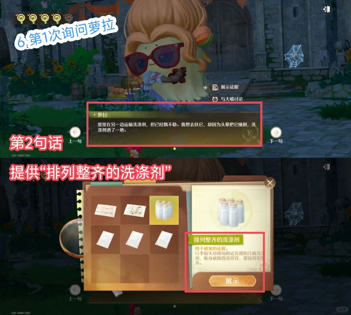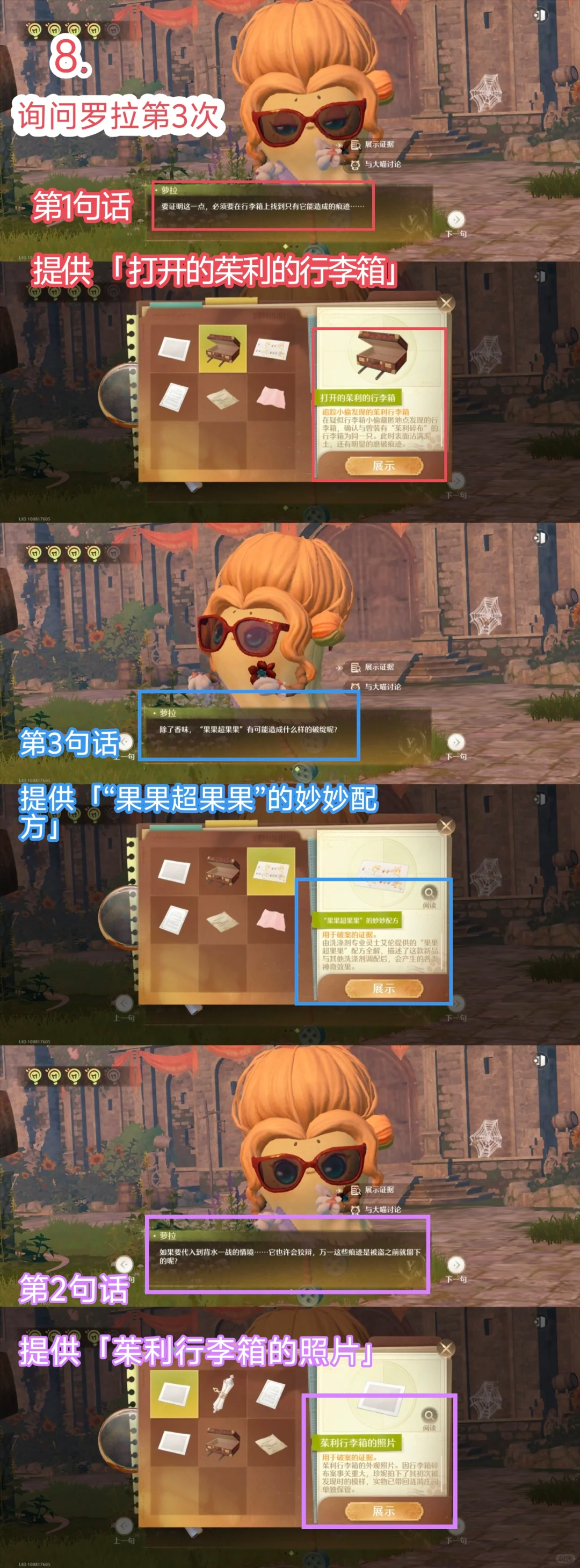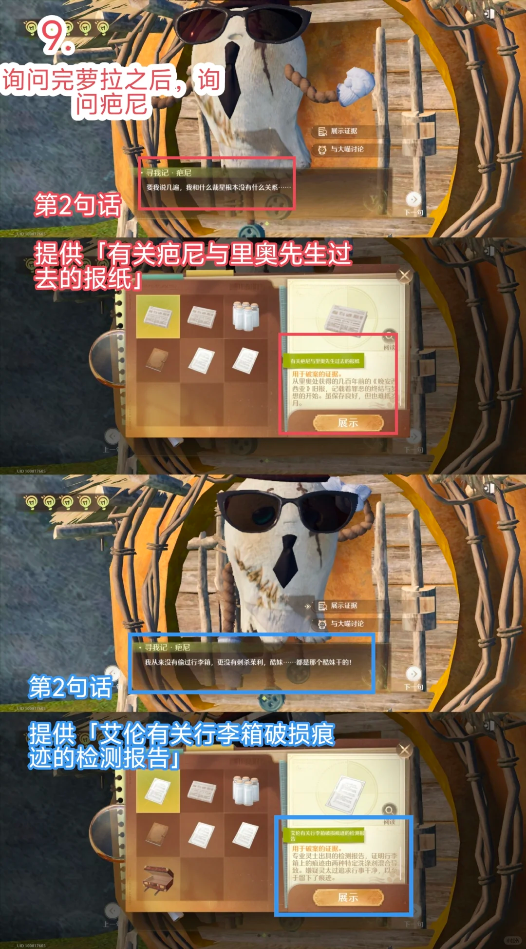 无限暖暖1.10丰收季主线任务中需要对角色选择并提交各种证据,询问托马斯时先选择托马斯的涟漪庄园特色名片,然后选择阿杯和朋友的合影;跟踪失败时提供疯狂戈登与萝拉往来的信件碎片,跟踪成功提供疯狂戈登与萝拉往来的信件照片,然后询问戈登选择提供里奥先生有关晨曦第一瓶的证词,完整的提交证词选项内容见下文详情!