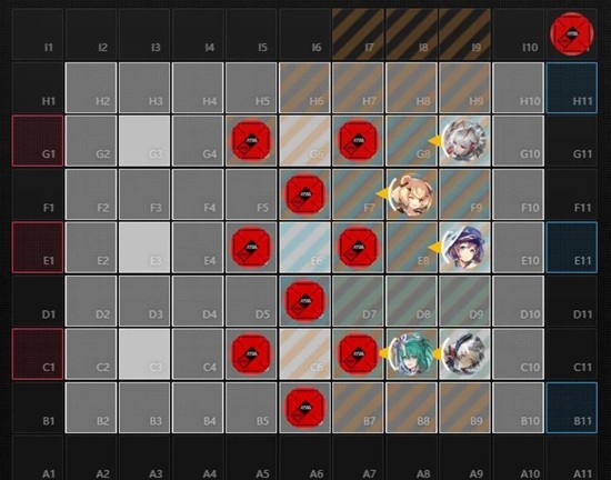 抓位思路:电弧任务必抓,地面c至少一个,如斩业星熊,水月,司霆惊蛰,玛恩纳,高台c优先级不如地面c,可选维什戴尔,逻各斯,新约能天使,任意治疗,推荐古米,遥,清流,图片仅为站位示意图,干员都可替换