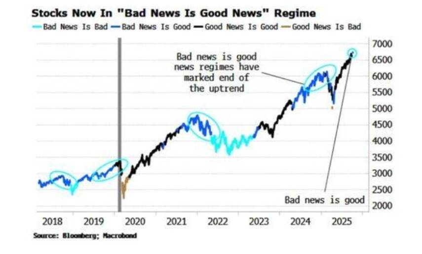 更值得警惕的是,据彭博分析师 Simon White 观察,市场已进入「坏消息就是好消息」的危险模式。在此阶段,疲软的经济数据反而会刺激股市上涨,因为投资者押注联準会将因此放鬆货币政策。这一反常现象,在过去几次主要市场顶部出现前都曾上演。