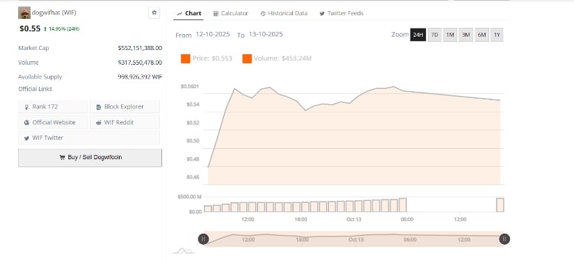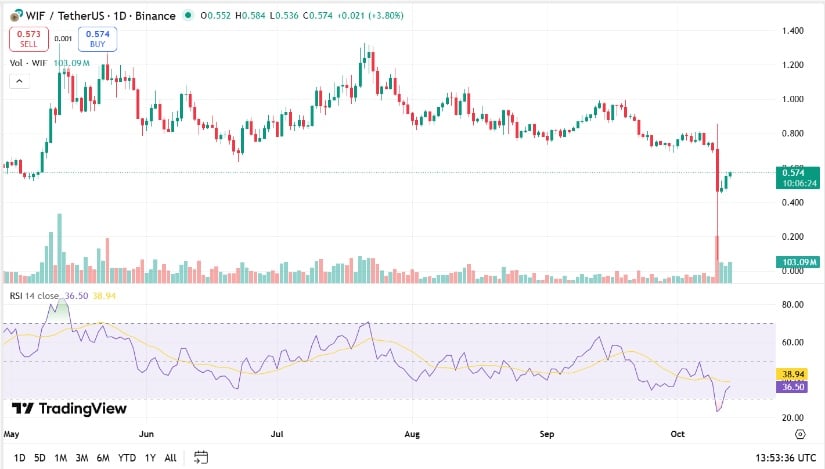 WIF/USDT日线图显示代币已从本月早前0.36美元低点反弹至0.56美元,日内微涨1.63%。8175万交易量表明投资者在清算潮后重新入场。图表中的蜡烛形态显示买家正试图在0.40-0.45美元区域构筑短期底部。
