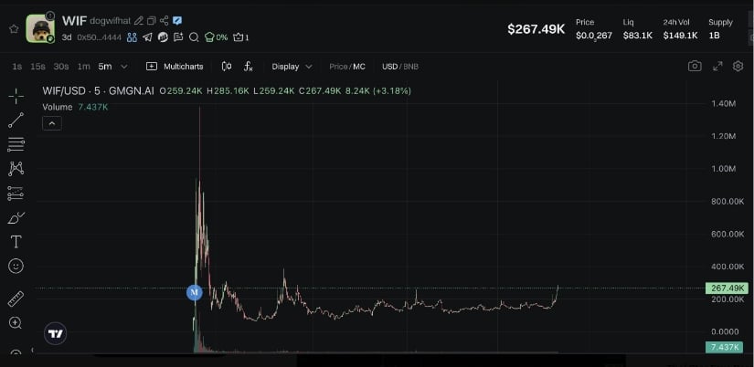 链上数据显示,自登陆币安智能链(BSC)后,大额交易者在狗戴帽币中的活跃度显著提升。据GMGN.AI统计,WIF/USD交易对上涨3.18%收于0.000267美元。流动性与交易次数的同步增长,反映投资者正将当前价位视为理想建仓区域。