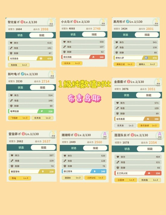 【金麋麋】是因为技能特殊所以基础攻击力高,【新叶龟】基础攻击力也与【黎光雀】差不多。