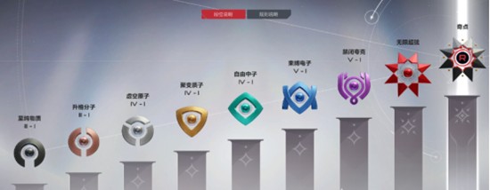 卡拉彼丘的段位体系共分为九个主要阶段,从低到高依次为至纯物质、升格分子、虚空原子、聚变质子、自由中子、束缚电子、禁闭夸克、无限弦以及最终的奇点。每个段位都设有明确的晋升条件,玩家需要通过完成对局任务、积累星星数量来逐步提升自己的排名等级。整个段位结构呈现出明显的阶梯式上升趋势,适合不同阶段的玩家参与竞技。