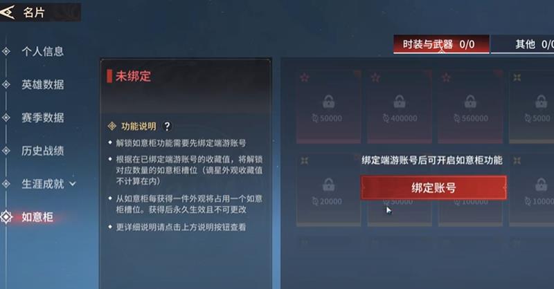 绑定完成后,玩家可以在个人资料页面找到如意柜玩法。通过如意柜功能,玩家可以查看已拥有的时装和武器数量,并选择部分道具进行共享使用。这个功能让玩家无需重复购买相同的物品,有效节省了游戏内的资源消耗。