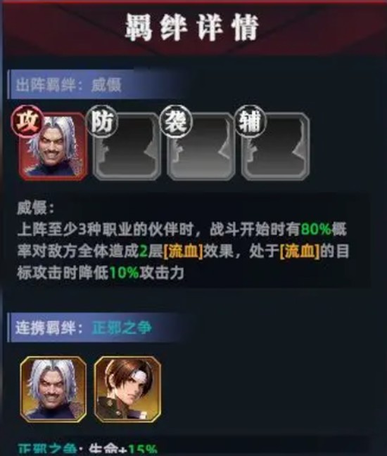 欧卢的羁绊机制不依赖特定角色组合,仅需上阵两名同职业类型伙伴即可激活,例如防袭、袭辅等搭配均可触发。激活后,欧卢在战斗开始时有80%概率为敌方全体施加两层流血状态,该状态最多可叠加至10层,每层持续造成真实伤害。对于已处于流血状态的目标,欧卢还能附加额外伤害加成,进一步提升输出效率。同时,流血目标的攻击力会降低10%,形成攻防双重压制,极大削弱敌方战斗力。