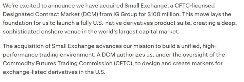 本次交易包含3250万美元现金及Kraken母公司Payward价值6750万美元的股权。Small Exchange持有美国商品期货交易委员会(CFTC)颁发的指定合约市场(DCM)牌照,这将使Kraken能在联邦监管下创建并上线自有衍生品。