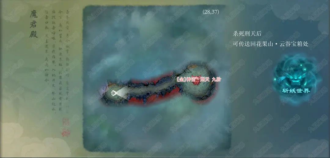 打完魔君殿九阶的boss之后会出现传送阵可以传送到花果山点云谷右上角的宝箱处