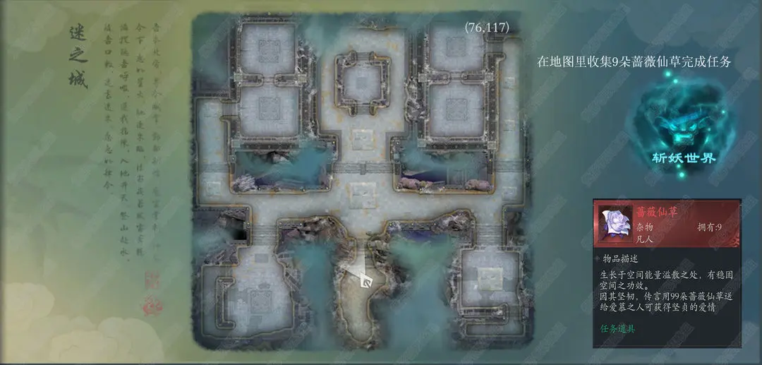 18、迷之城在地图里收集9朵蔷薇仙草完成任务
