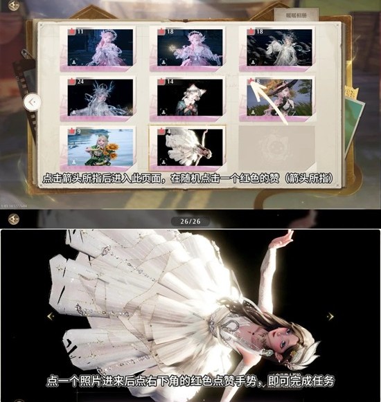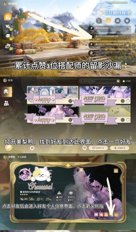 打开美梨鸭,找到好友进入,随机点一个好友的名片,进入名片后点击右下角像相册点击进去就有好友的拍照留影,没点赞的点赞就可以完成任务了,点过的要点击照片进去才能点赞 点赞三位好友的即可完成任务