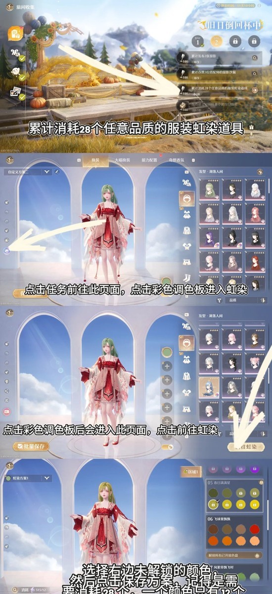 点击任务进入页面,点击彩色调色板进入虹染页面,点击前往虹染进入后,右边选择一个未解锁的颜色,点击保存虹染即可完成任务(一个颜色只能消耗12个)