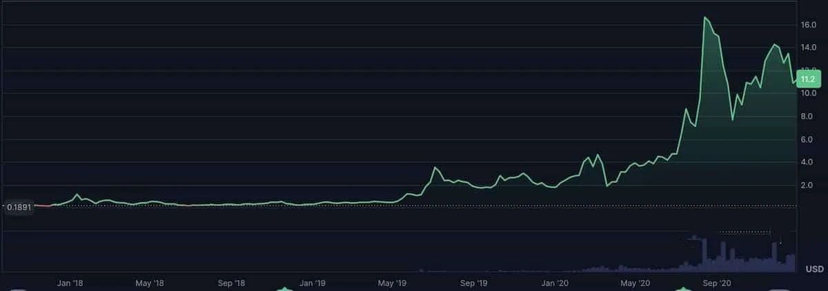 Chainlink (LINK) 诞生于 2017 年,最初作为ICO 加密货币以 0.11 美元左右的价格交易。最初,它并没有引起太多关注,价格也停滞不前。但从 2019 年起,随着去中心化金融 (DeFi) 的扩张,需求开始增长,价格大幅上涨。