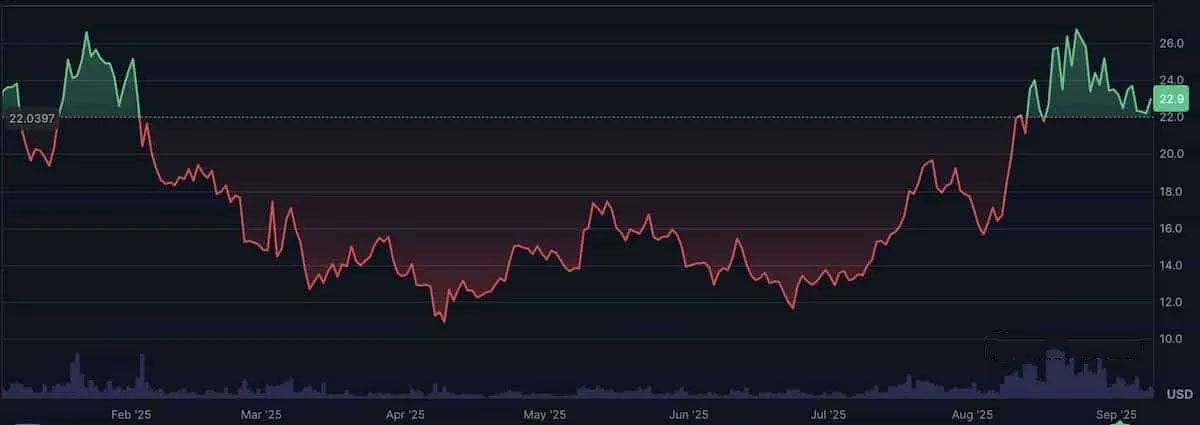 Chainlink (LINK) 2025 年的价格走势受到其作为去中心化数据平台日益增长的应用以及监管环境变化的影响。从年初到年中,由于与主要金融机构合作的消息以及对预言机技术需求的增加,其价格呈现强劲走势。