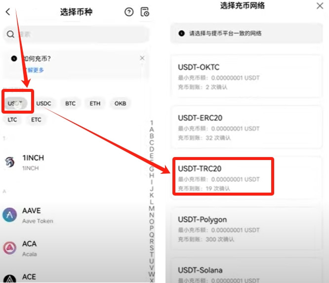 这里我们找到“USDT”,这个链我们选择TRC20。