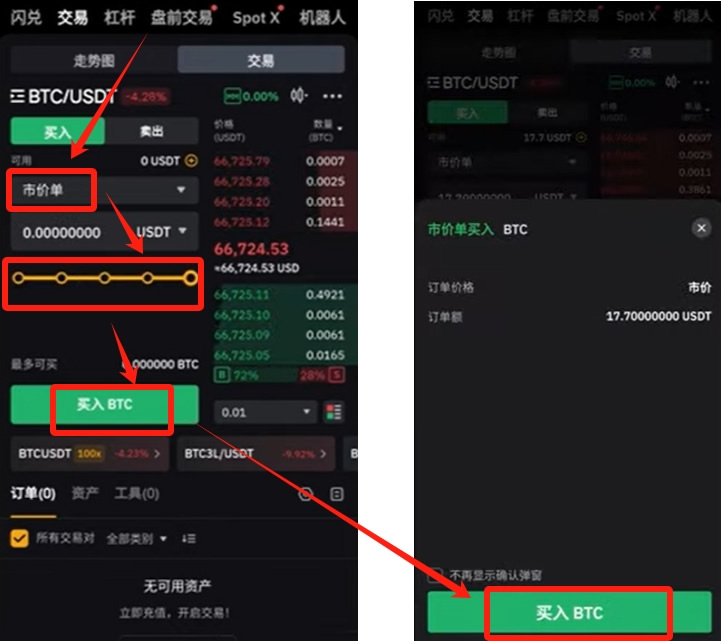 如果你想立刻成交的话,就可以选择市价单。市价单这里价格就不需要自己填了。平台会以当前市场最优惠的价格来给我们下单。我们直接输入想要购买的数量,我这里把它拉满,点击【买入BTC】。