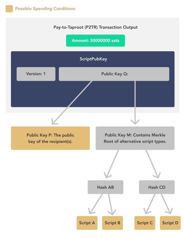 Schnorr 的密钥聚合功能实现了这种灵活功能。当比特币发送到 P2TR 输出时,它被锁定到一个名为 Q 的单个公钥。但是,这个公钥 Q 实际上是一个由公钥 P 和由许多其他脚本的 Merkle 根形成的公钥的聚合。可以使用 Merkle 树中的任何替代脚本来花费输出。