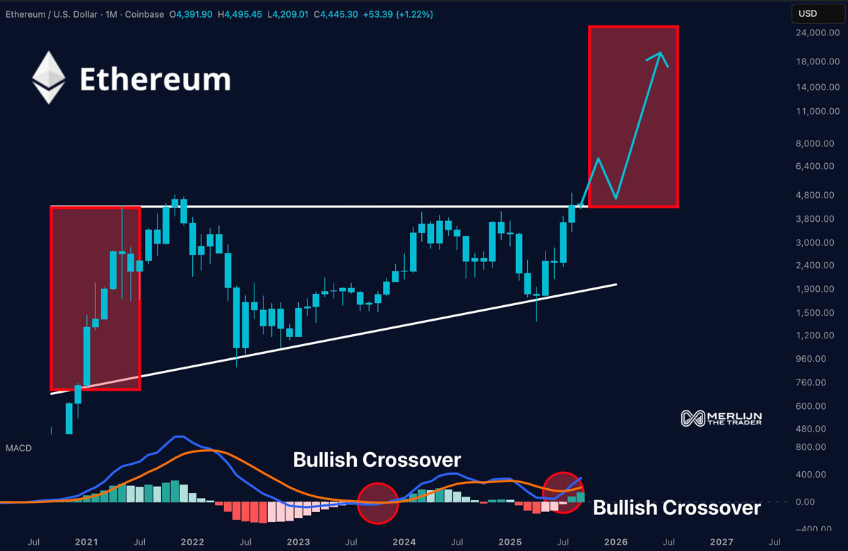 “MACD刚刚转绿。三年压力蓄势待发。月线K线仅显示出一个信号:多头。突破4,500美元,以太坊将迎来抛物线式上涨。”