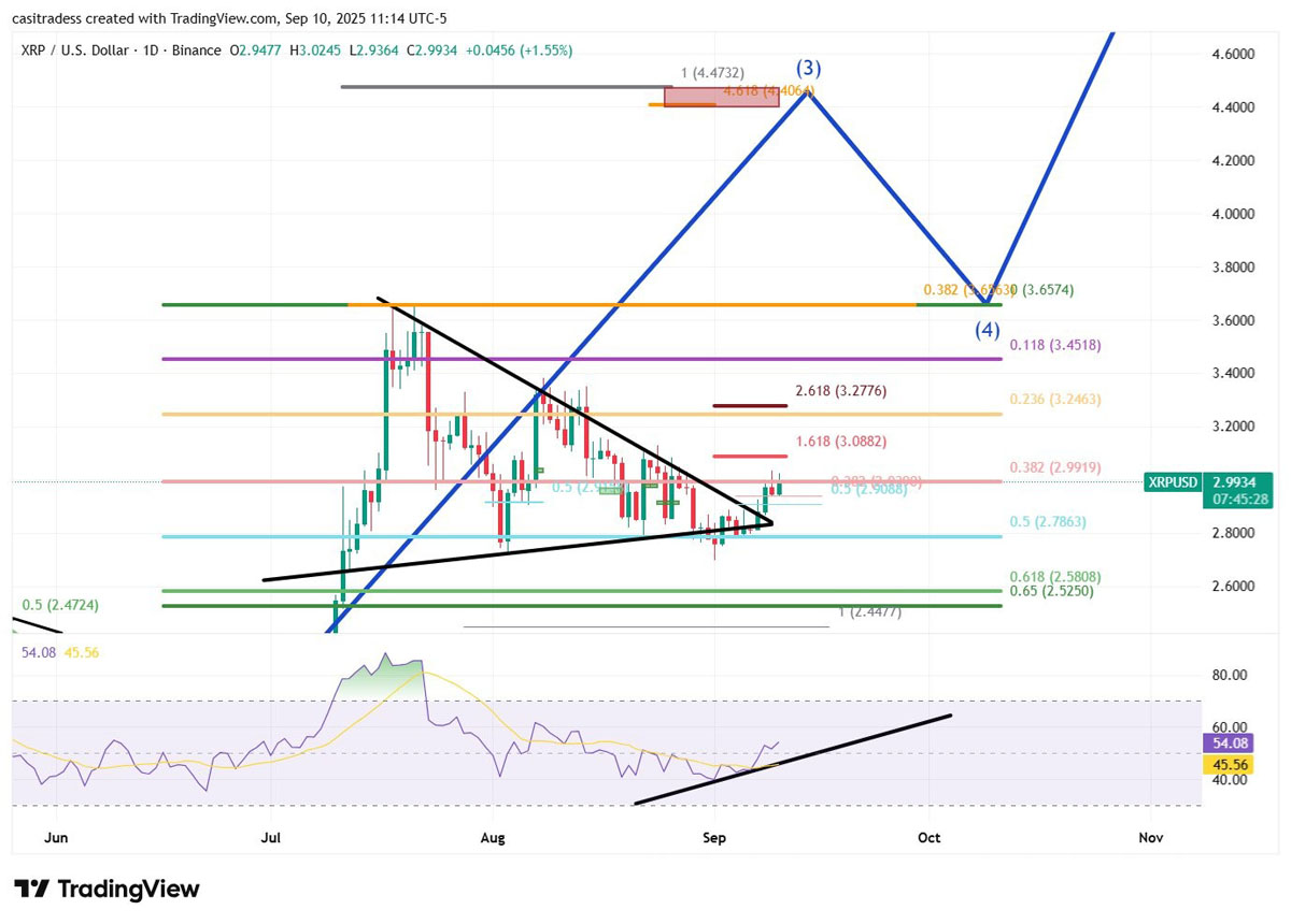 分析师 CasiTrades 周三在 X 平台发文称:“XRP 已经突破了数月的盘整阶段,并在 3 美元关口的测试中确认了这一突破。”
