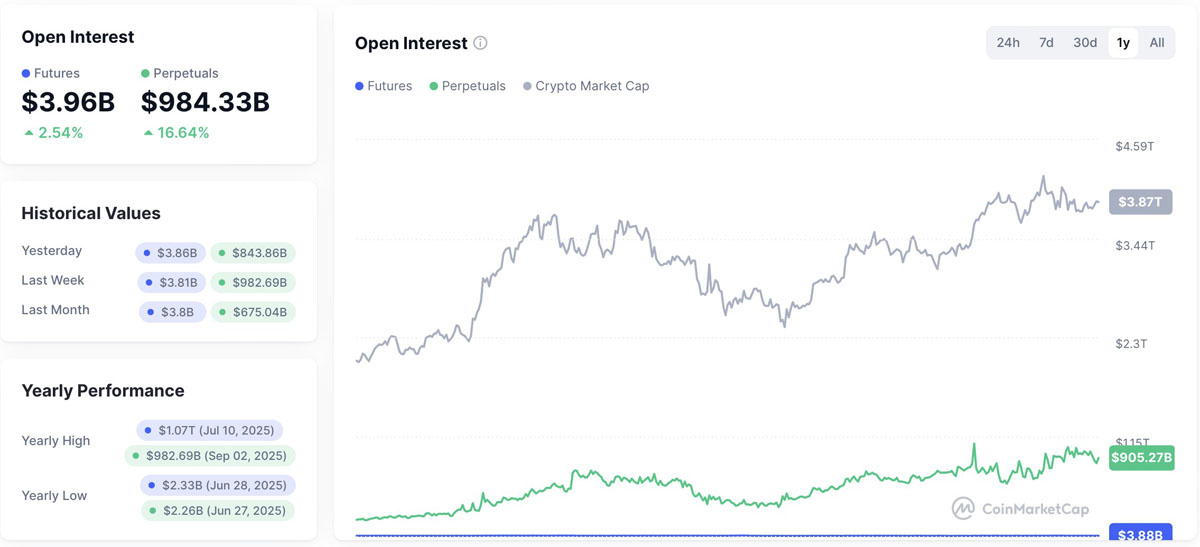 据CoinMarketCap数据显示,目前加密衍生品的未平仓量总额约为期货39.6亿美元、永续合约9840亿美元。