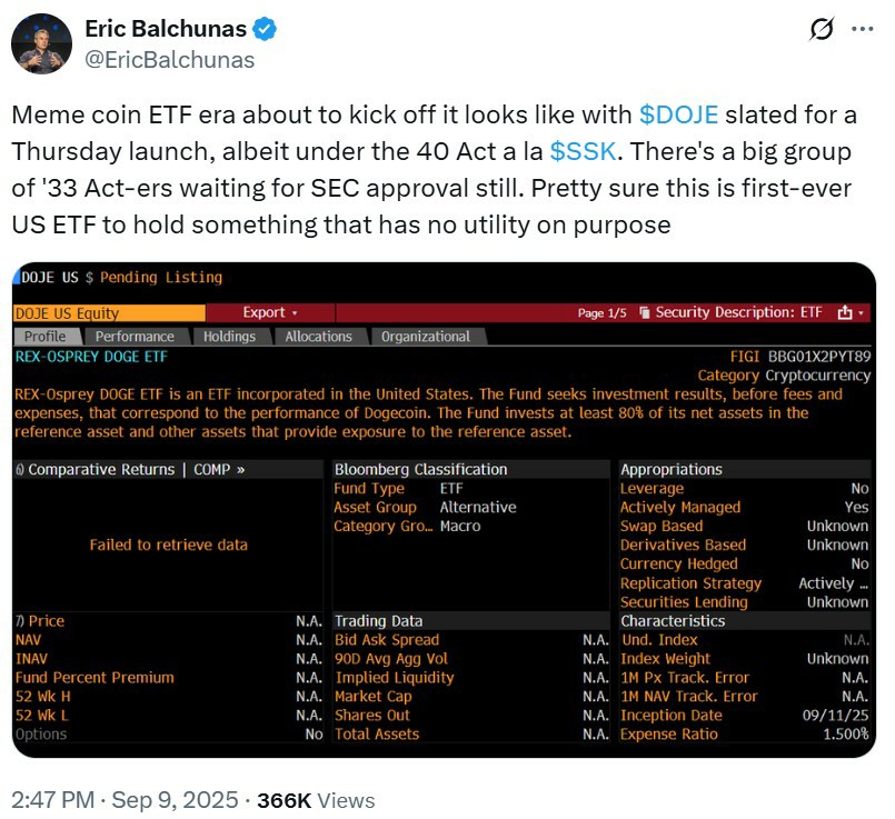 与根据1933年《证券法》批准的比特币ETF不同,Rex-Osprey狗狗币ETF(DOJE)是依据1940年《投资公司法》获批,该框架通常用于共同基金和多元化型ETF。