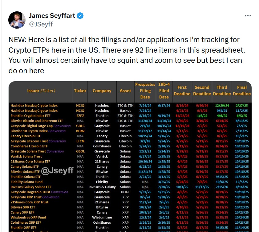 美国加密ETP申请名单继续增长。来源:James Seyffart