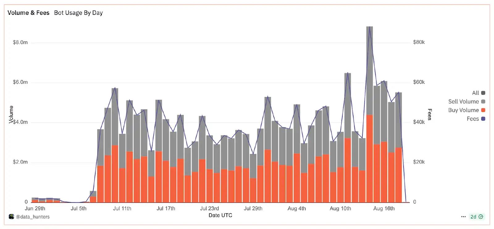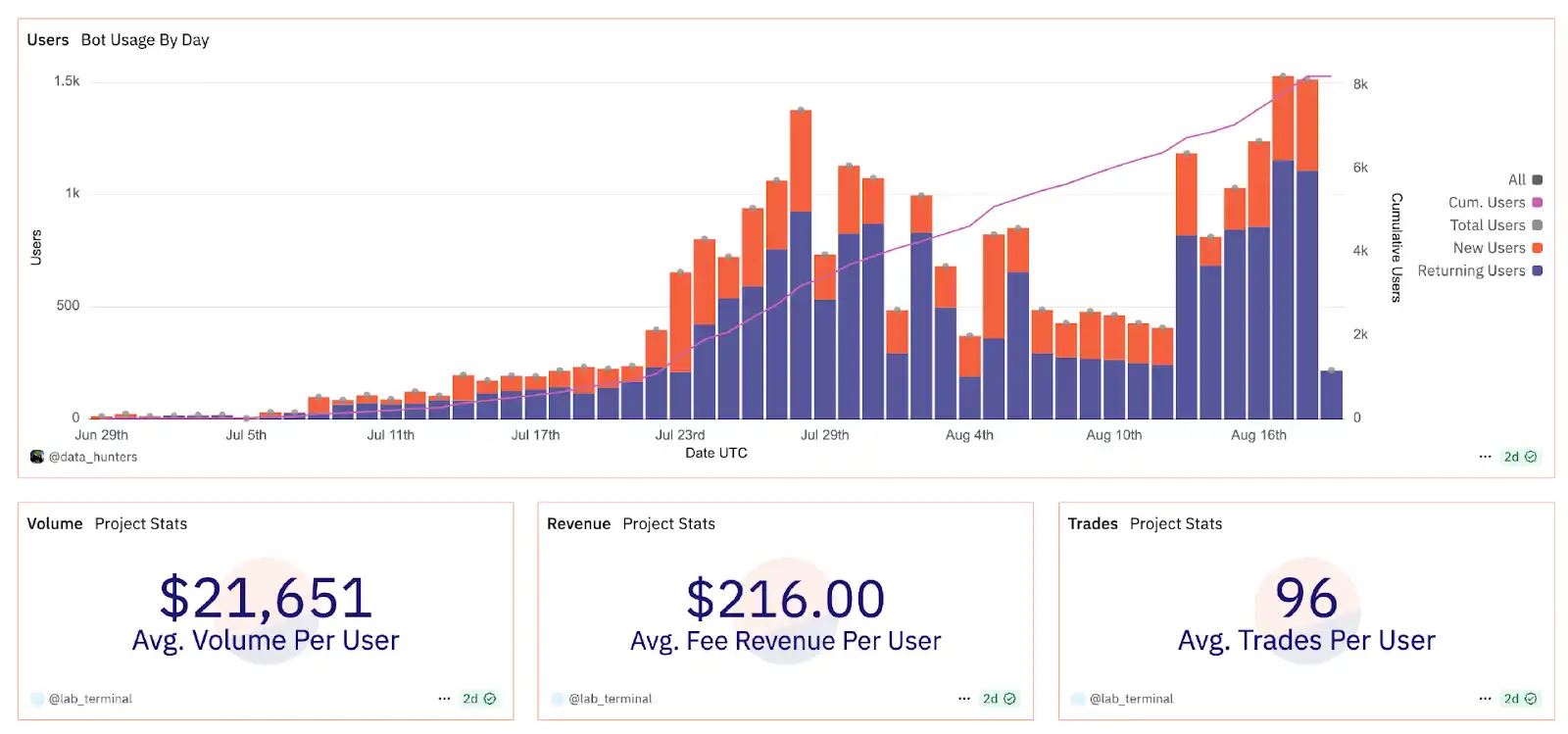 这些数字背后,是用户用真金白银投出的信任票。高达 2.1 万美元的人均交易量和 216 美元的人均手续费贡献以及 96 次的户均交易次数。在与 BonkBot、Trojan 等先行者的激烈竞争中,LAB 凭借其只需一半的交易费用以及体验上的优势,正展现出巨大潜力。