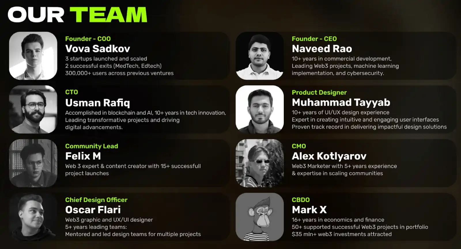 CTO Usman Rafiq 和 CMO Alex Kotlyarov 等核心成员均具备多年行业经验,曾领导多个项目。