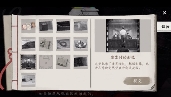 隐藏章节名为飞绳奇案,开启后需要对案发现场进行全面搜查。首先观察房顶区域,注意绳索悬挂的位置及其固定方式。接着查看房间布置与案发时的现场影像记录,从中可以推断出绳子来源于死者本人携带。进一步调查可发现,绳结采用了魔术假绑手法,真正的连接线隐藏在吊灯内部的管道中,这一细节是破案的重要证据之一。