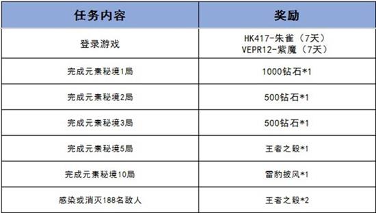 活动参与方式极为便捷!只需在元素探秘活动中完成指定任务,即可领取丰厚奖励(详情请见下方任务清单)。重点提醒:累计感染或消灭188名敌人的任务目标需投入较多时间,尤其对新手玩家而言挑战较大。建议尽早参与地图挑战,赢取全部活动奖励!