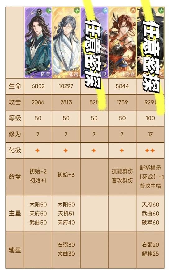 一般来说命盘该有我独,不要动而/取予。带一个风一个火密探,其他随意,一个个杀小兵就行