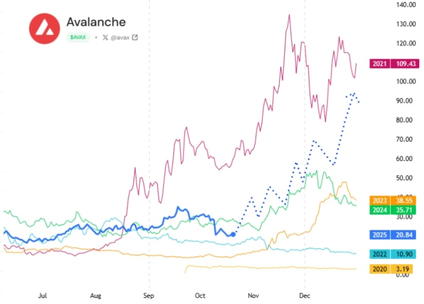 进入年末季度,雪崩协议叙事持续获得关注。正如Share强调的,AVAX往往在年底阶段达到峰值,这种历史周期规律显示第四季度后期的上涨通常会引发大幅走高。