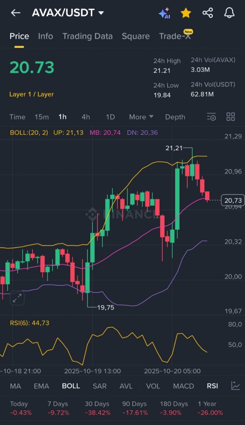 短期图表显示动能正在重建,AVAX价格从月中低点稳步攀升后重新站上20.7美元。Crypto Emperor分享的图表显示,价格正在布林线中轨上方盘整,同时RSI升至45附近——该水平往往预示着扩张行情的启动。