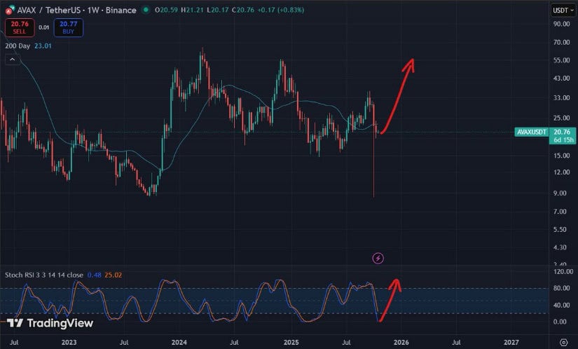 随着动能重置和吸筹形态初现,AVAX周线指标发出早期看涨信号。来源:RebornAli3N via X