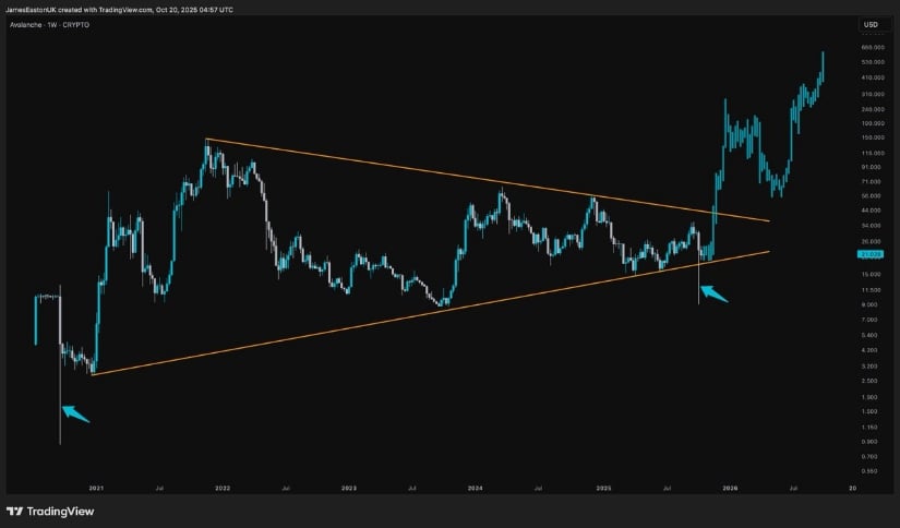 James指出重复出现的"John Wick"分形模式,此前相同的压缩结构曾引发爆炸性上涨。当前形成的对称楔形与2021年的形态高度吻合,而该形态曾推动AVAX飙升至140美元上方。