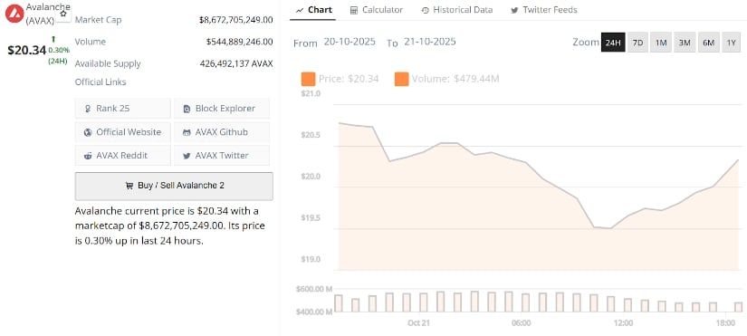 雪崩协议现报20.34美元,24小时上涨0.30%。来源:Brave New Coin