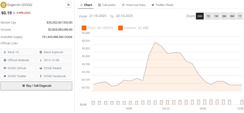 截至发稿,狗狗币报0.19美元附近,24小时跌幅3.49%。来源:Brave New Coin