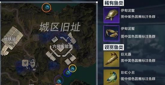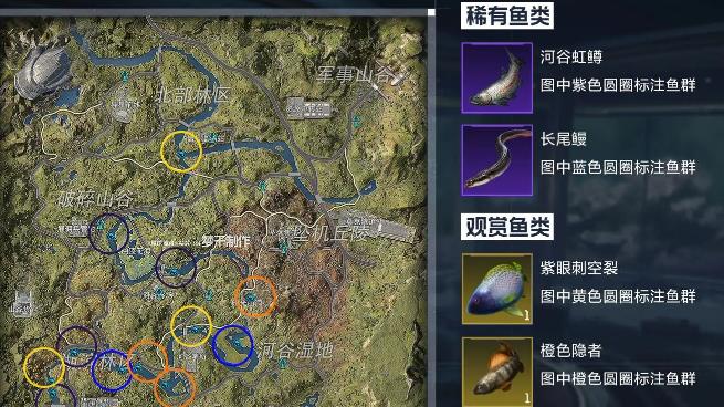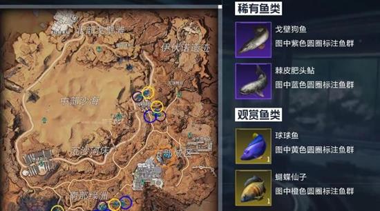 鱼类食材需要通过钓鱼获得。杜加河谷水域盛产胡子鲶、河谷鲫鱼、异鳌虾和春花鱼,稀有鱼类如长尾鳗和河谷虹鳟可以在特定坐标的稀有鱼群处钓到。尖叫戈壁各鱼群能钓到头斑乌鱼和异鳃鳜,海滩附近则有刺手青和异鳃鲢,戈壁拘鱼和棘皮肥头贴需要在稀有鱼群坐标处垂钓。伊甸城水域产出异鳃胖头鱼和异碳草鱼,鱼群中能钓到巨化泥揪和异甲沼虾,稀有鱼类伊甸泥鳖和伊甸泥蟹则分布在地图的特定坐标位置。