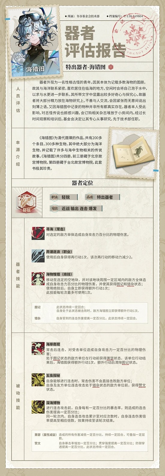 被动1:常击后连击,对受击单位造成自身攻击力一定百分比的物理伤害,处于图记状态敌方单位在行动前获得萧瑟状态,该单位行动结束后,海错图获得额外行动1次,额外行动后清除图记状态。