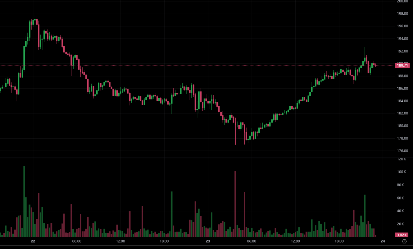 值得一提的是,或许受此消息激励,加上昨(22)日香港推出了其首档 SOL 现货 ETF,在今(23)日的加密货币市场中,SOL 成为了表现最强的主流代币,今日一度突破 190 美元。